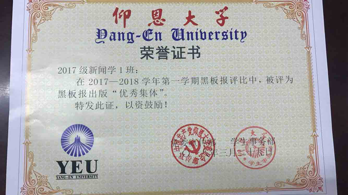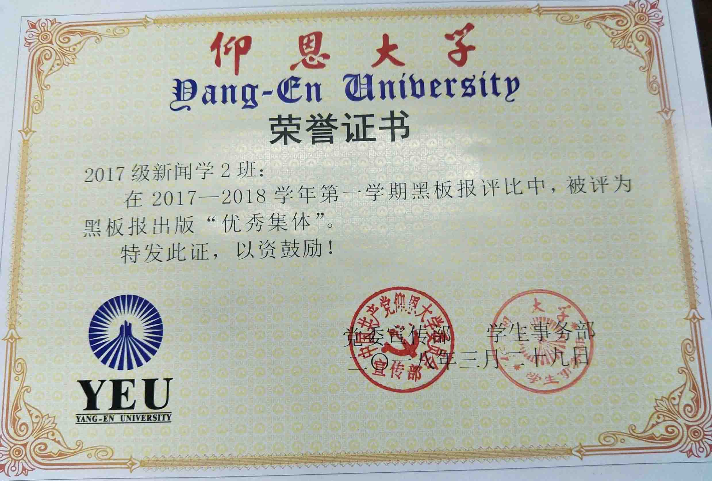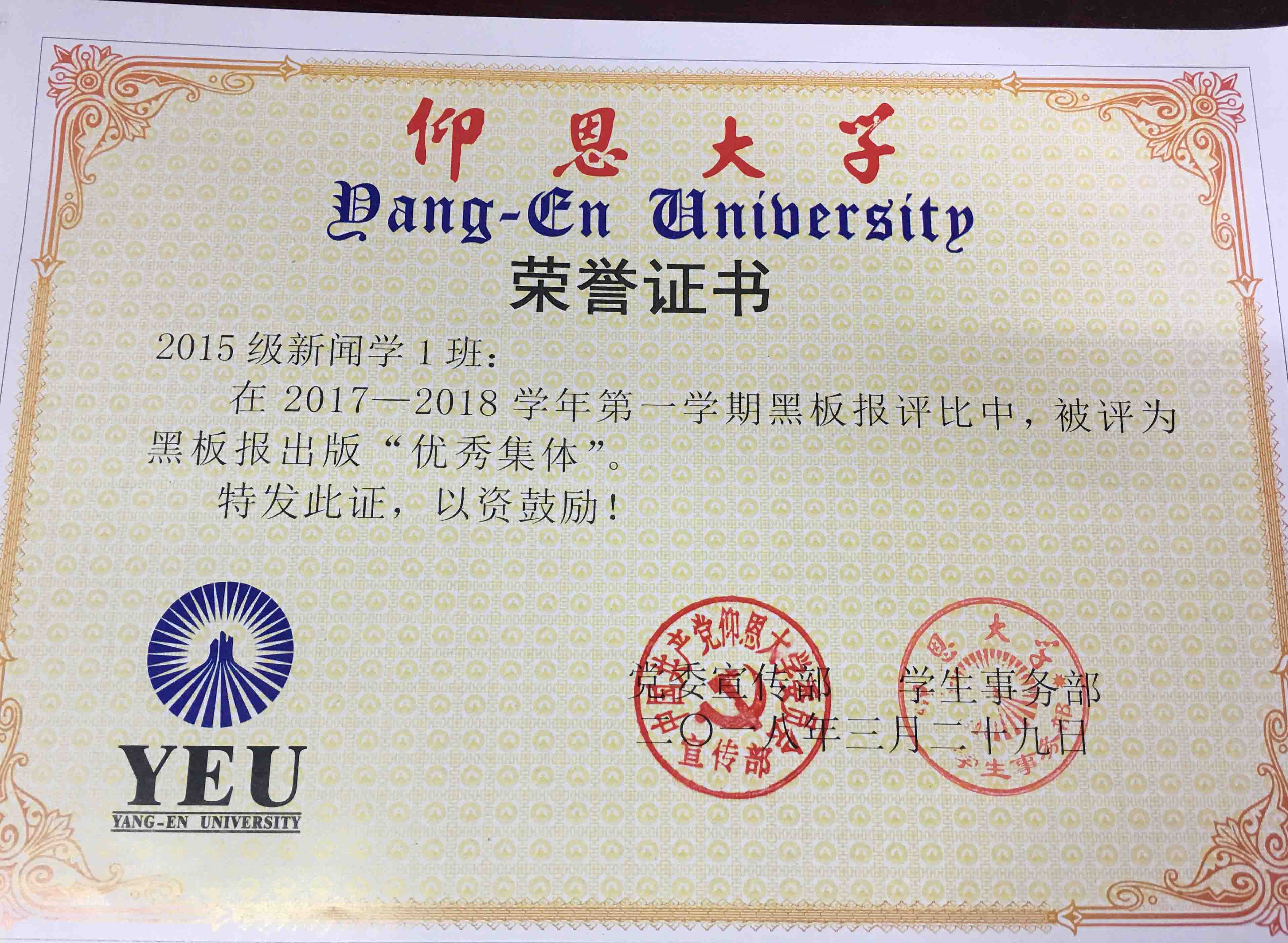 在2017—2018学年第一期黑板报评比中,yl7703永利集团有5个班级被评为黑板报出版“优秀集体”,他们分别是15新闻学1班、15汉语言文学2班、16汉语言文学1班、16汉语言文学2班、17新闻学1班、17新闻学2班、17广告学1班。
