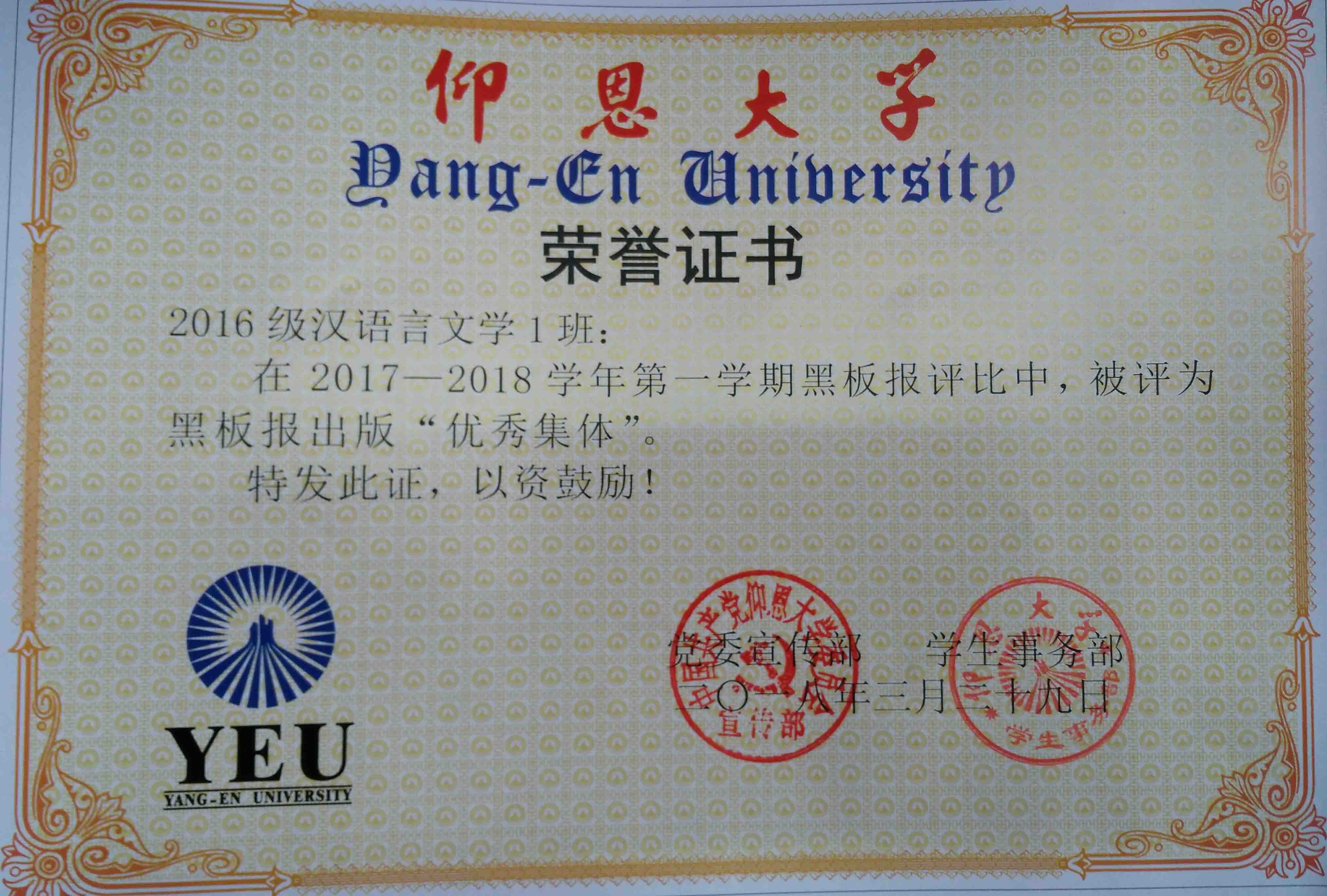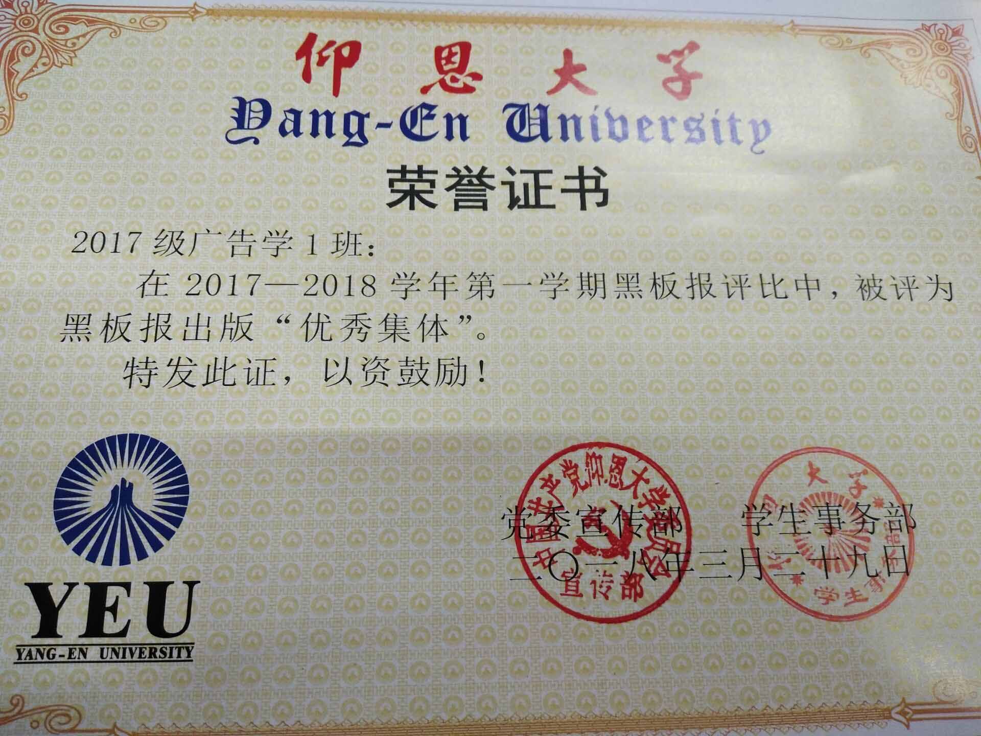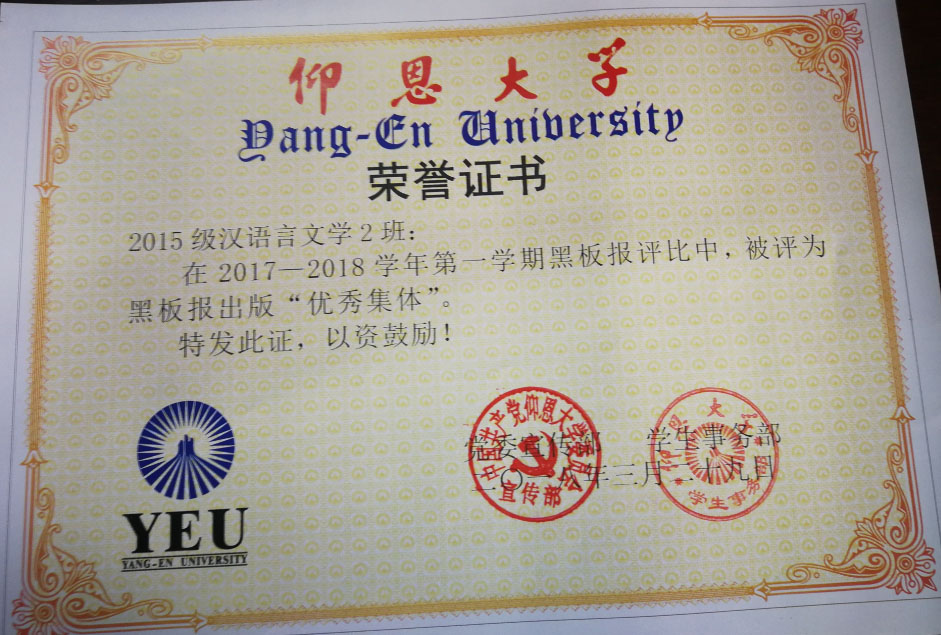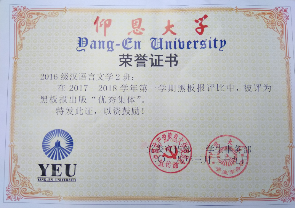 在2017—2018学年第一期黑板报评比中,yl7703永利集团有5个班级被评为黑板报出版“优秀集体”,他们分别是15新闻学1班、15汉语言文学2班、16汉语言文学1班、16汉语言文学2班、17新闻学1班、17新闻学2班、17广告学1班。