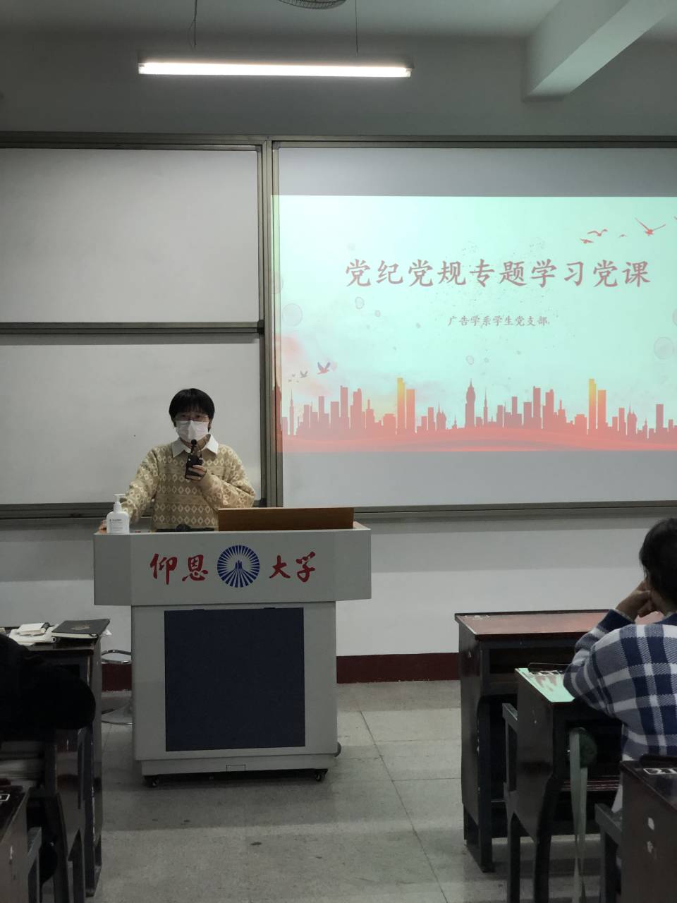 为进一步增强党员的党规党纪意识,自觉做到守纪律、讲规矩、知敬畏、存戒惧,发挥党员先锋模范作用。11月22日晚,yl7703永利集团广告学系党支部在仰恩楼B1-207开展“党纪党规”专题学习。此次专题学习由广告学系学生党支部书记王君婷老师进行主持及关于党纪党规的学习教育。