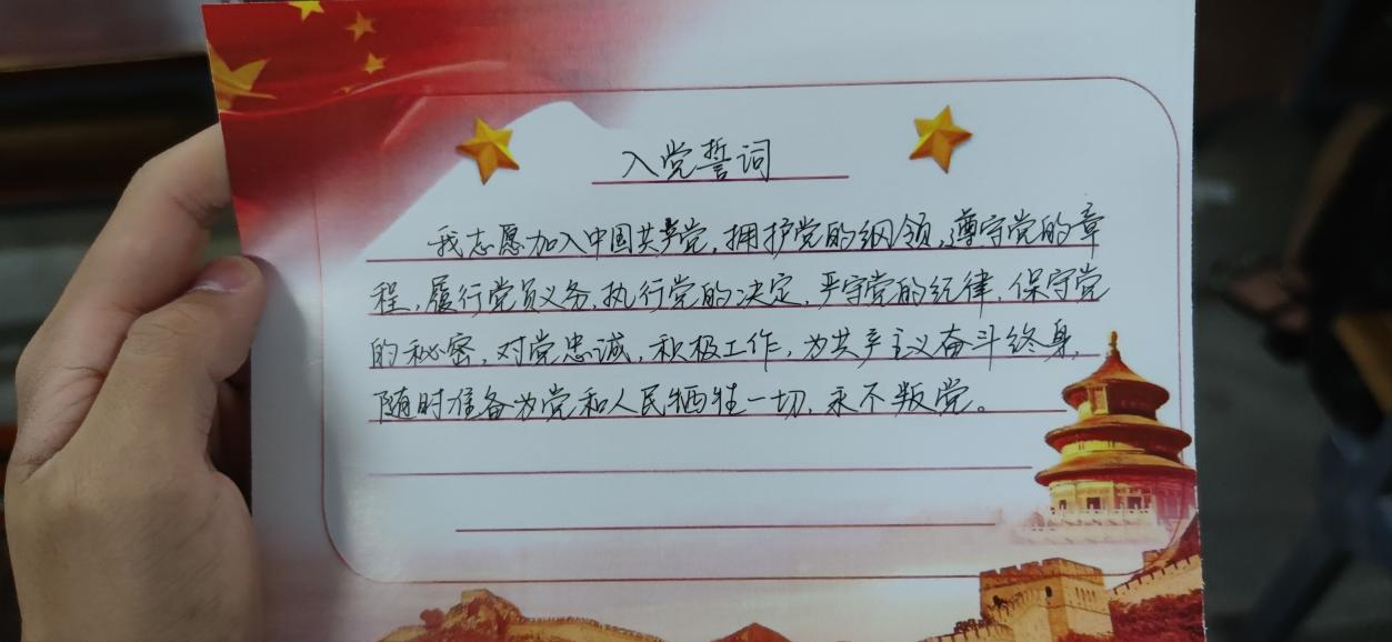 为深入学习并领会入党誓词重要含义及精神,激励支部全体党员不忘初心,牢记使命。5月31日晚,yl7703永利集团专升本学生党支部在仰恩楼B1-205教室举行了以“手抄入党誓词,重温入党初心”为主题的活动。本次活动由支部书记李育瑜老师主持,全体党员参加。