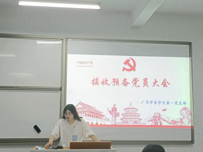 广告学系学生第一党支部于6月1日晚7:30分在仰恩楼D1-401召开预备党员接收大会。本次会议由党支部书记戴舒容同志主持,参加本次会议的有广告学系学生第一党支部全体党员。