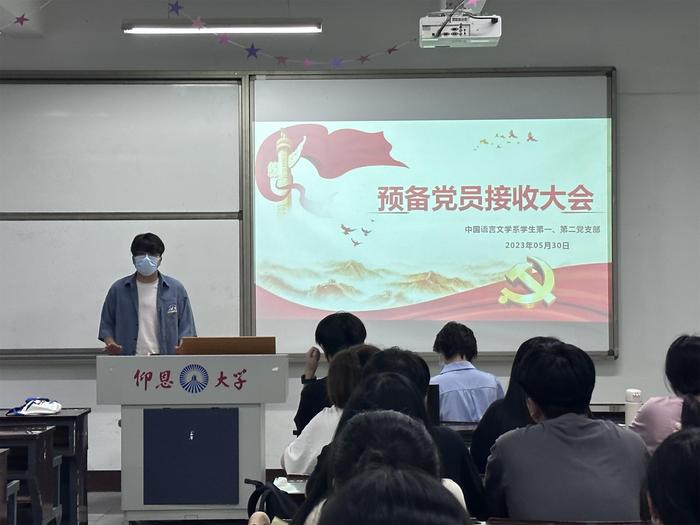 中国语言文学系学生第一、第二党支部于5月30日晚上19:30在仰恩楼B1-201联合召开预备党员接收大会,学生第一党支部书记张梓昱、学生第二党支部书记谢云出席本次会议。