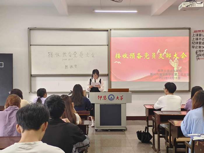 为进一步加强和推进党员队伍建设,切实提高党员发展质量,保持党员队伍先进性和纯洁性,12月11日下午,新闻传播学系学生第二党支部在第三教学区普照楼202召开预备党员接收大会,本次会议由支部书记吴萍萍同志主持,支部全体党员同志及发展对象参与此次会议。本次大会的主题是以接收陈姝贤同志为中共预备党员展开。