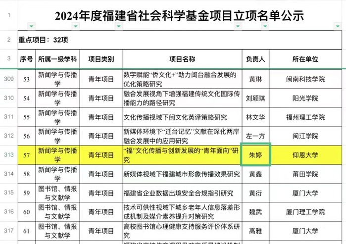 近日,2024年福建省社会科学基金项目立项名单公示,我院教师朱婷所申报的《“福”文化传播与创新发展的“青年面向”研究》获得立项。