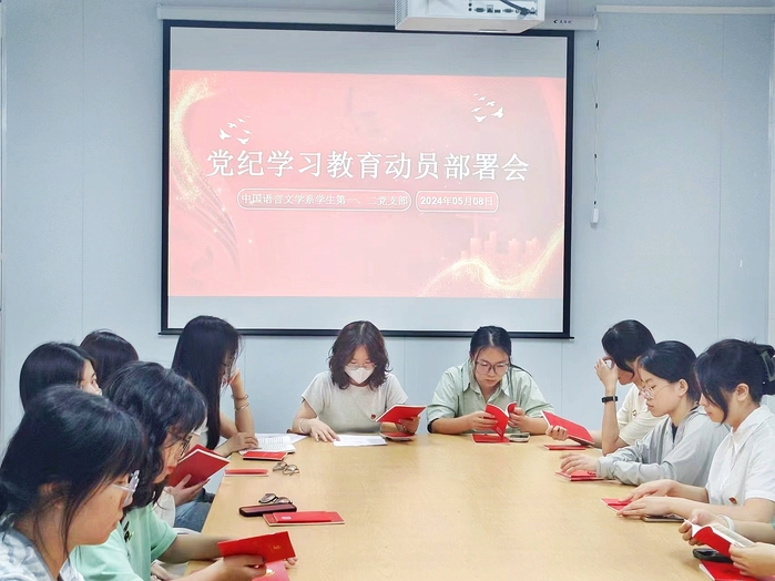 2024年5月8日晚19:00,中国语言文学系学生第一、第二党支部于致远书院召开党纪学习教育动员部署会。会议旨在贯彻落实党的二十大精神,全面加强支部思想建设,进一步推动支部全体党员坚定理想信念、强化纪律意识。一支书记唱菲璠和二支书记谢云主持此次会议。
