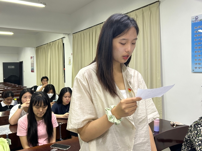 池培新、罗雨欣、张亚欣、周丽云四名同志对支部大会的讨论意见及结果进行了发言,对党组织批准其成为正式党员表示由衷感谢,并表示在未来的学习生活中,会自觉接受党组织的一切监督和考验,不断完善自我,在实践中践行全心全意为人民服务的宗旨。