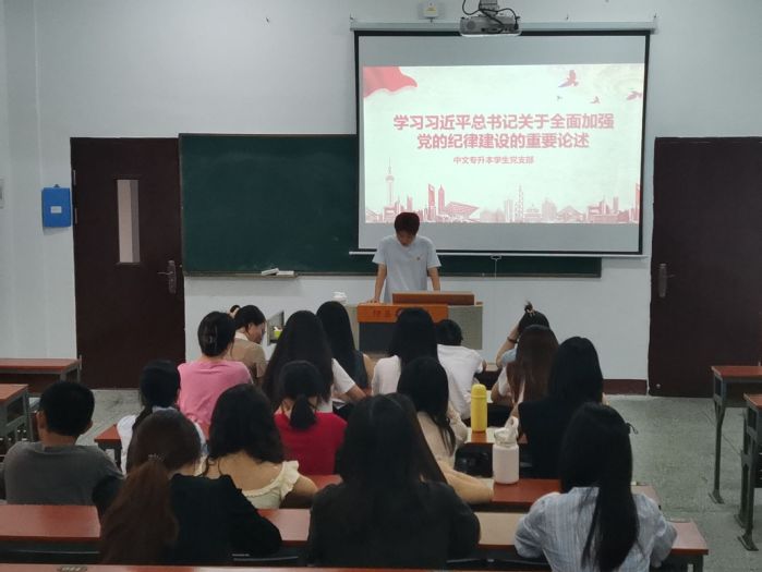 6月19日上午,中文专升本学生党支部在祥贤楼306召开“学习习近平总书记关于全面加强党的纪律建设的重要论述”专题研讨会,本次研讨会由支部书记施晓渝老师主持,支部全体党员同志参与此次活动。