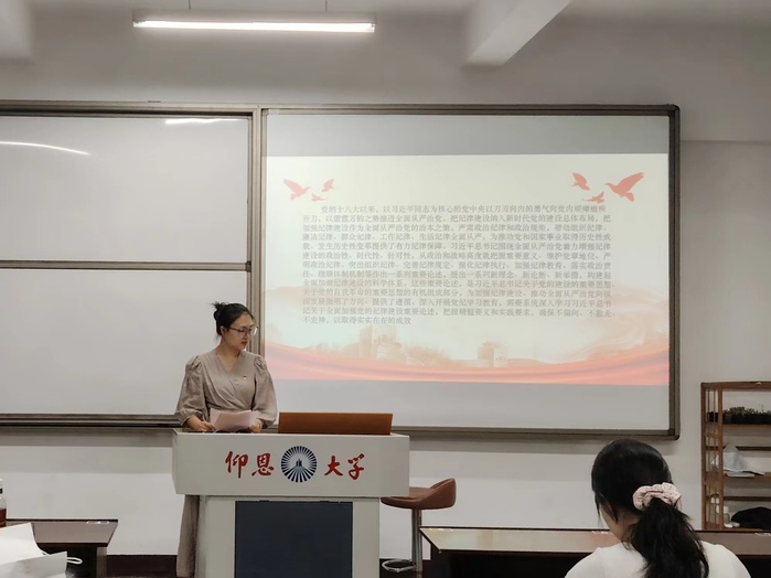 2024年6月20日晚,中国语言文学系学生第一党支部于仰恩楼C3-301开展了党纪学习教育专题党课。此次党课由支部书记唱菲璠主讲,旨在进一步增强党员们的廉洁自律意识,推进反腐败斗争,塑造风清气正的政治生态。