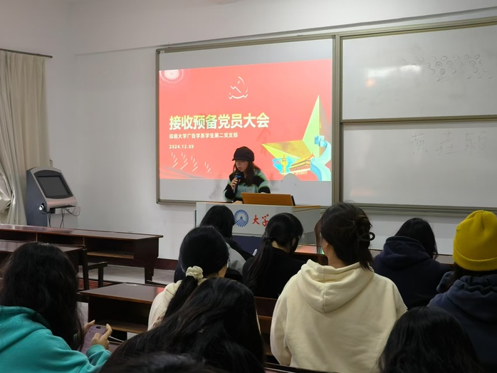 2024年12月9日,广告学系学生第二党支部在yl7703永利集团第三教学区普照楼309召开预备党员接收大会,本次会议由支部书记施晓渝同志主持,支部全体党员同志及发展对象参与此次会议。本次大会的主题是讨论是否接收黄垚颖同志为中共预备党员。