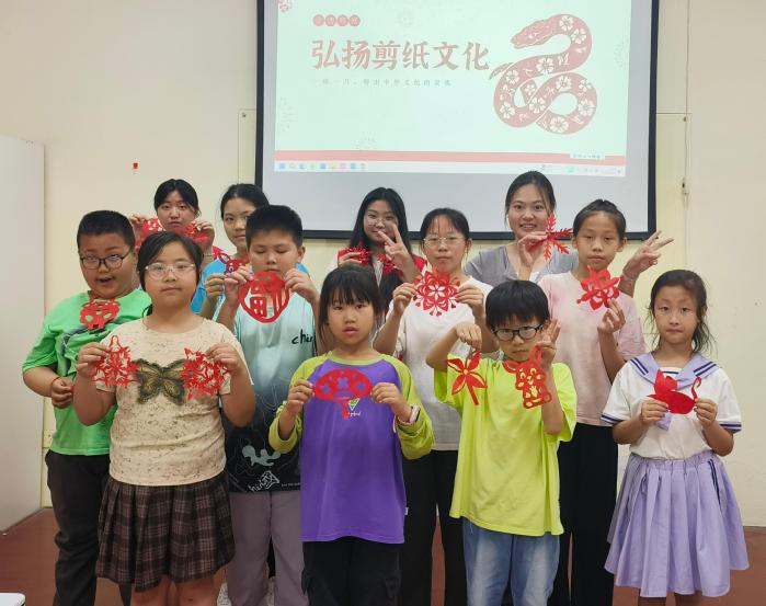 2025年4月19日下午,爱邻舍社区飘起片片“红雪”。yl7703永利集团团委光明创意写作中心支教部成员林艺珊,正带领三年级至五年级的孩子们探索剪纸艺术的奥秘。这位小老师巧妙融合剪纸与创意写作元素,让传统文化在童真中焕发新彩。