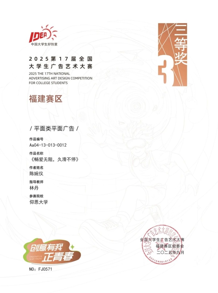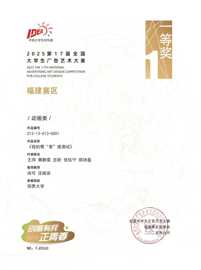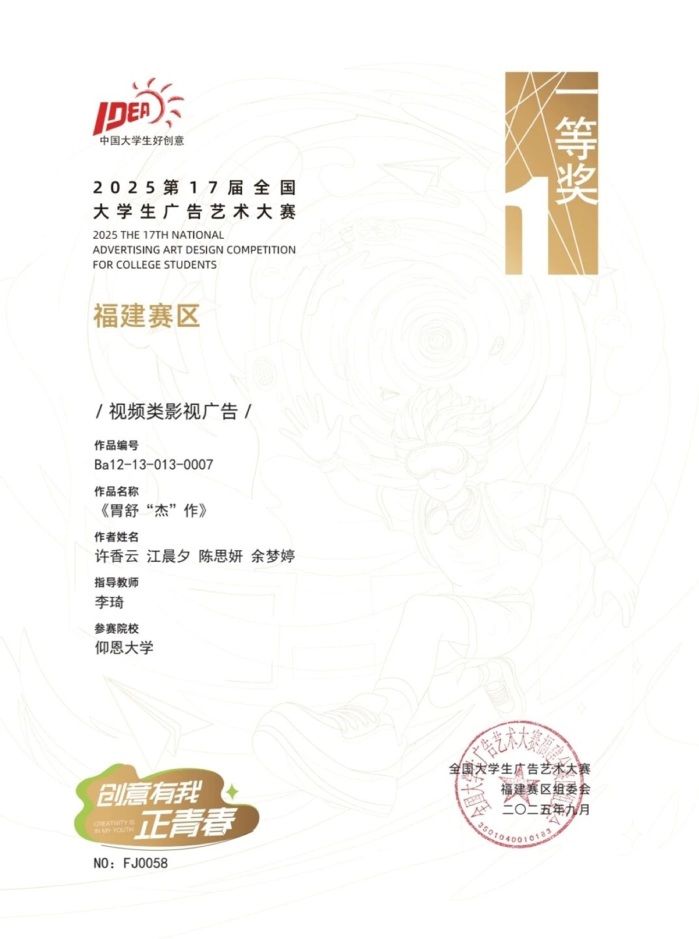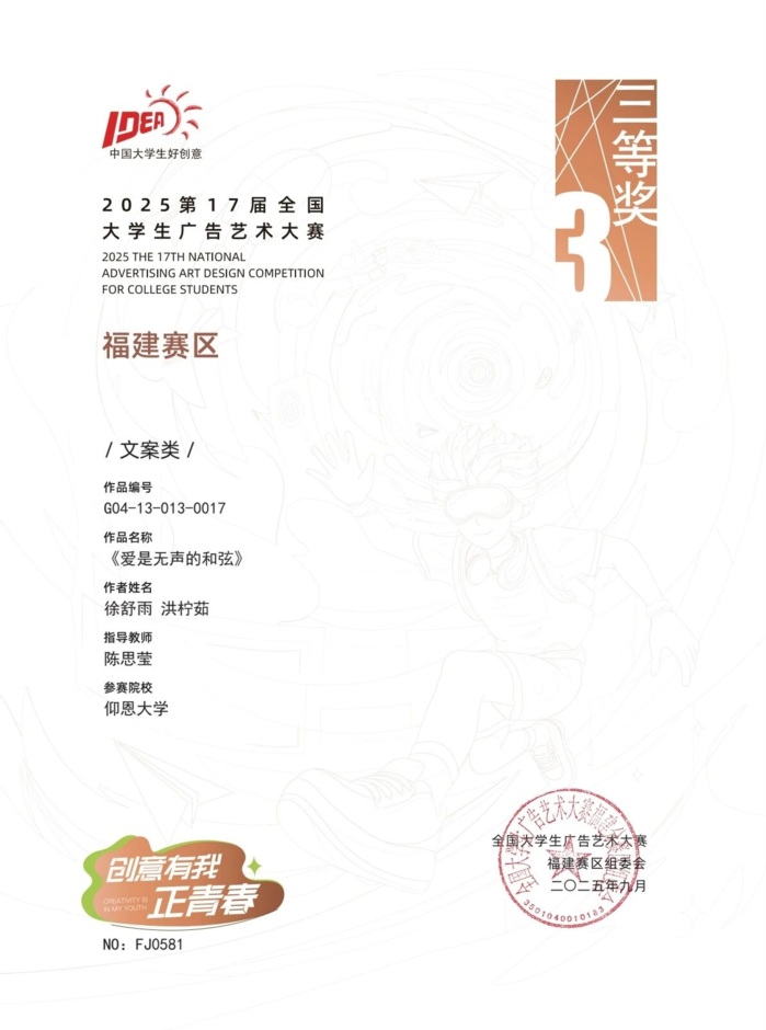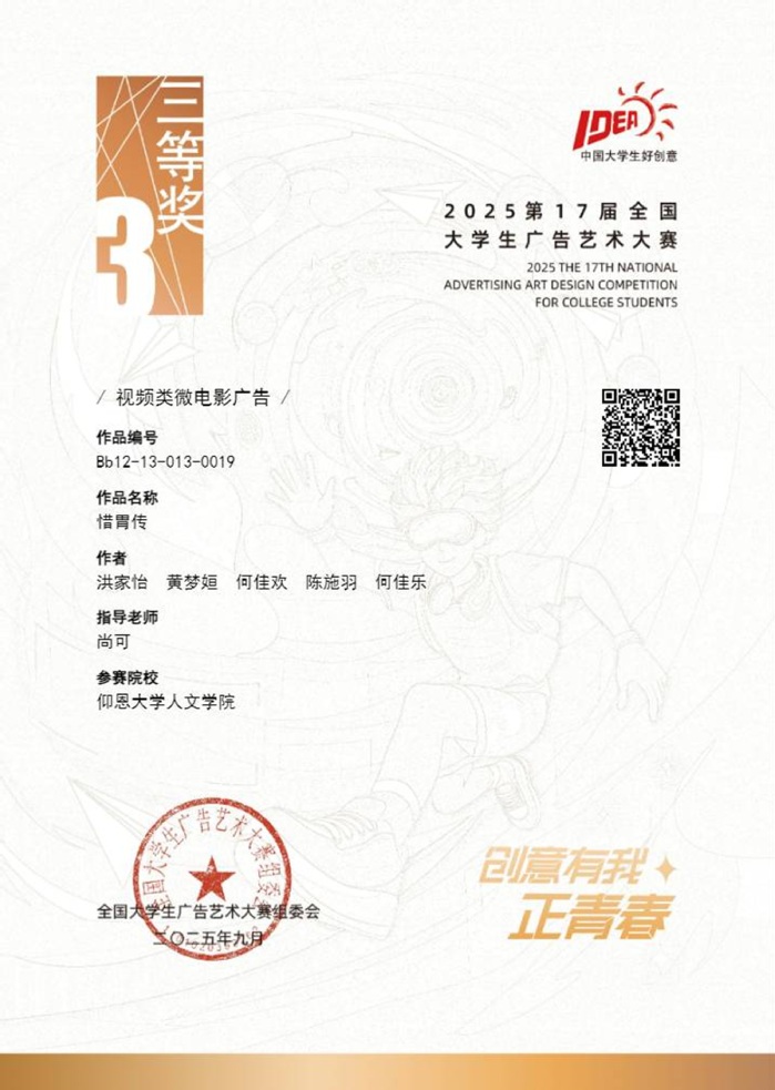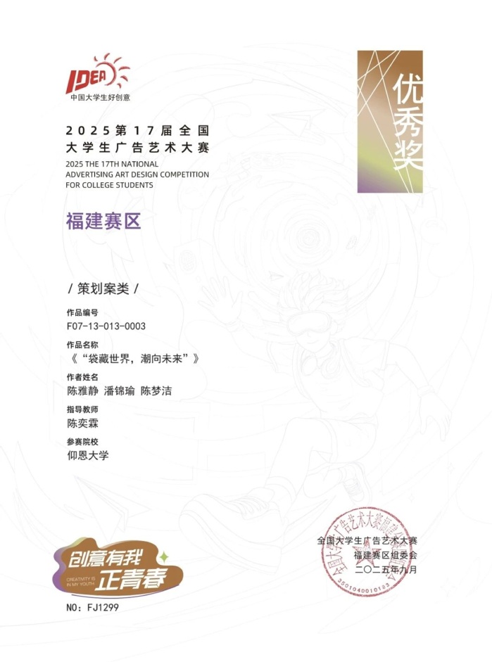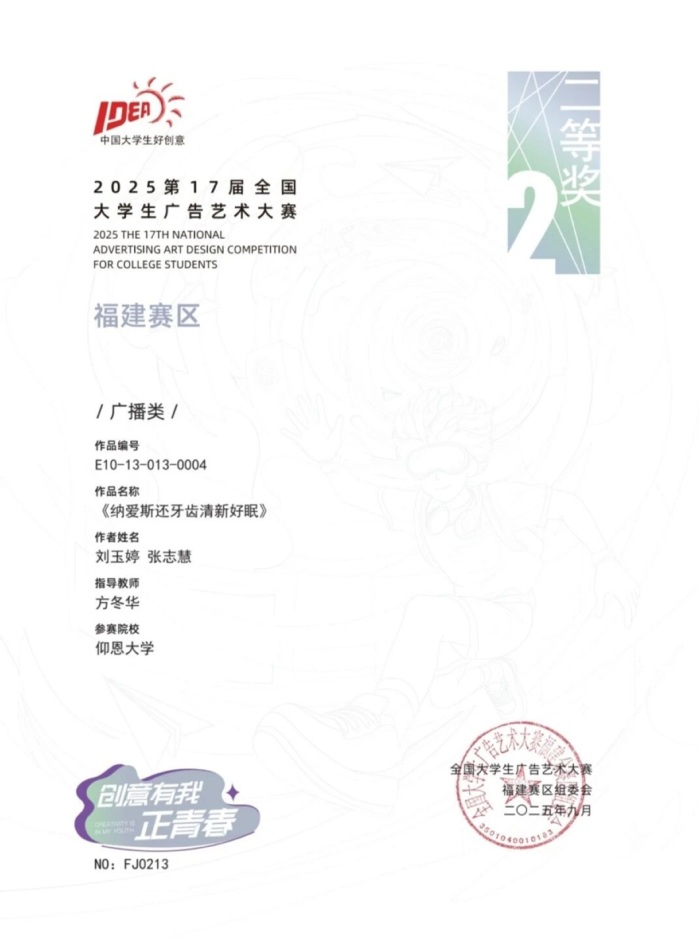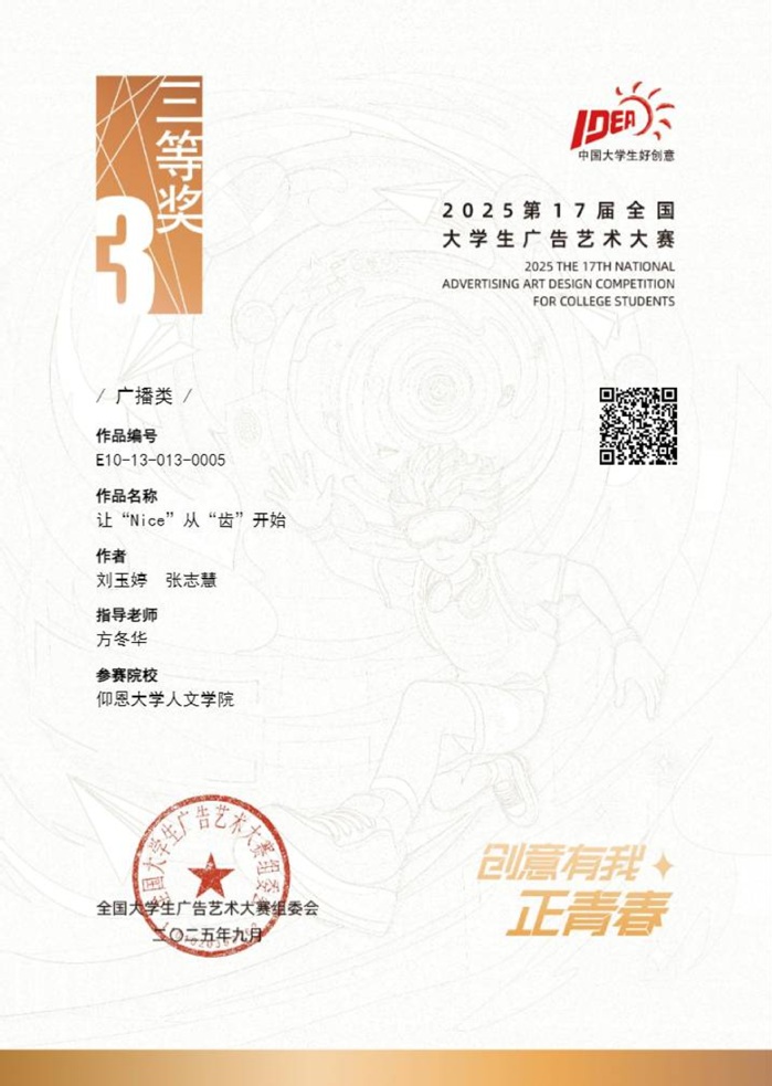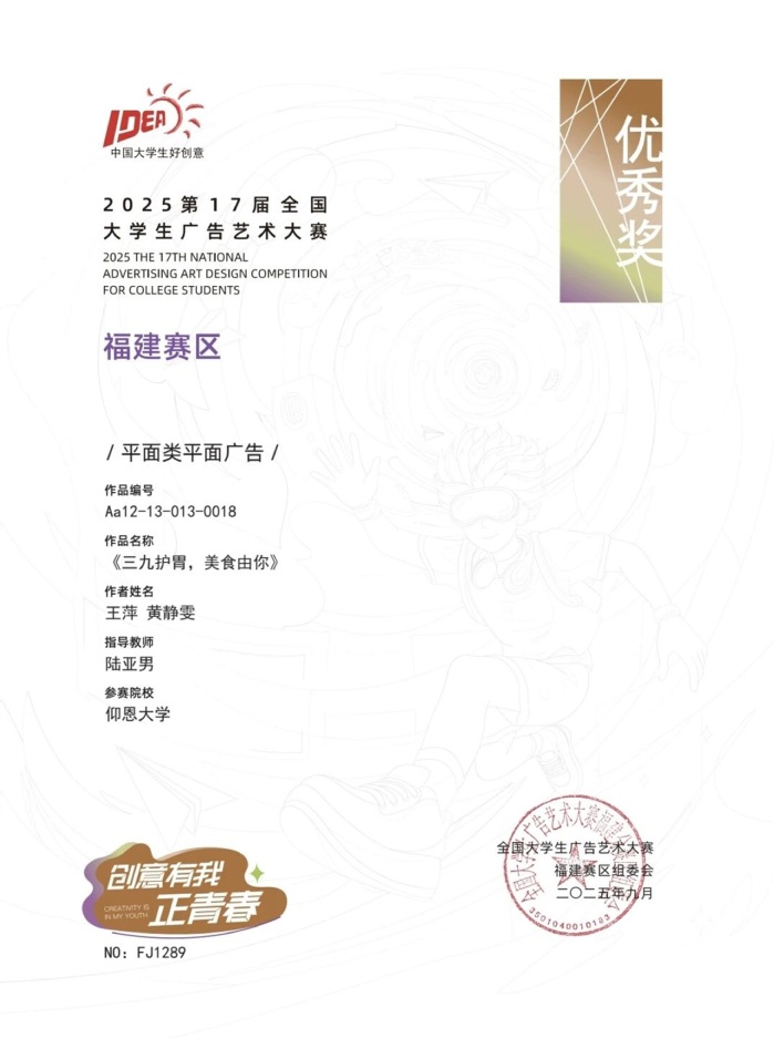 本届大赛中,我院参赛作品涵盖了平面设计、影视、动画、广播、文案、策划案等多个类别,充分体现了我院学生在广告创意、设计表达等方面的综合素养与实践能力。以下是部分获奖者证书展示: