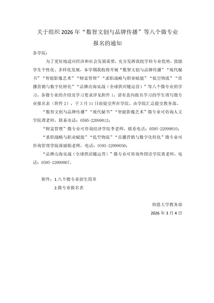 3月4日,根据学校教务部发布的通知,我院申报的“数智文创与品牌传播”“现代秘书”“智能影像艺术”三个微专业全部获批立项建设,正式面向全校本科生招生。